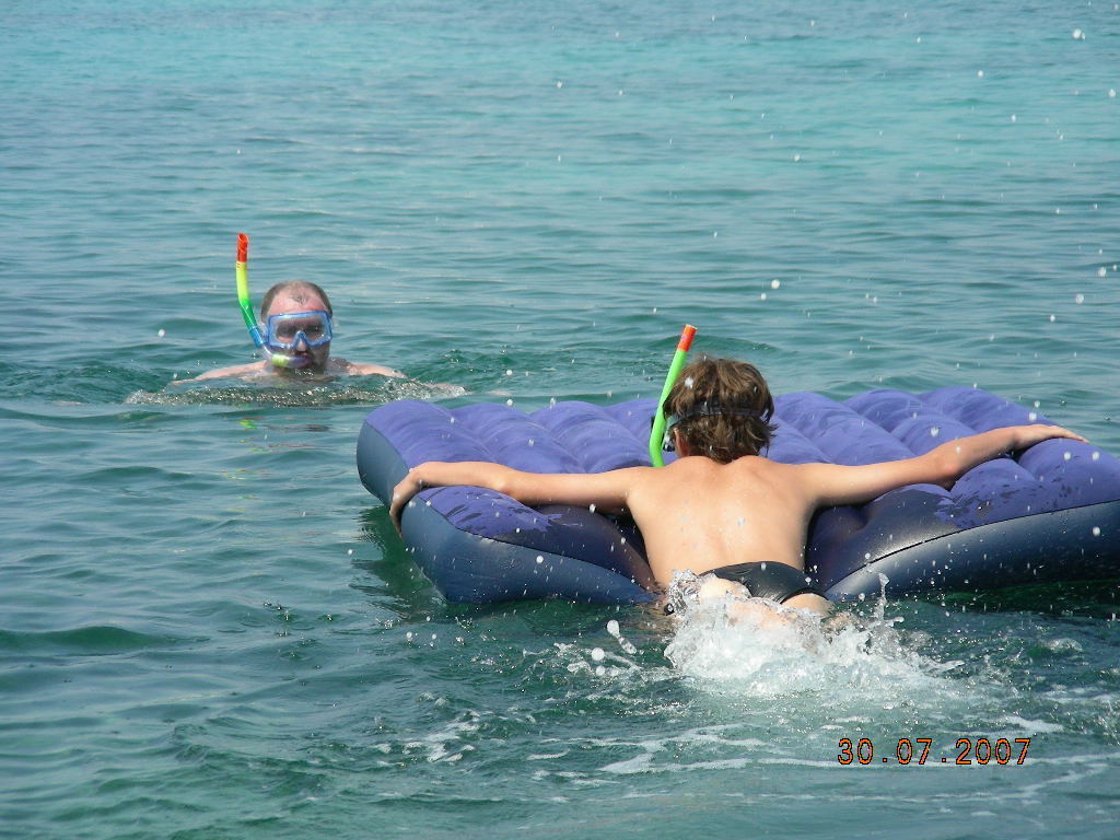 Oczywiście kąpiemy się w nowym miejscu. Wracamy do domu po Tomka. Nasz syn docenia to miejsce - pływa, nurkuje, wreszcie do obciętej plastikowej butelki łapie jeżowca.