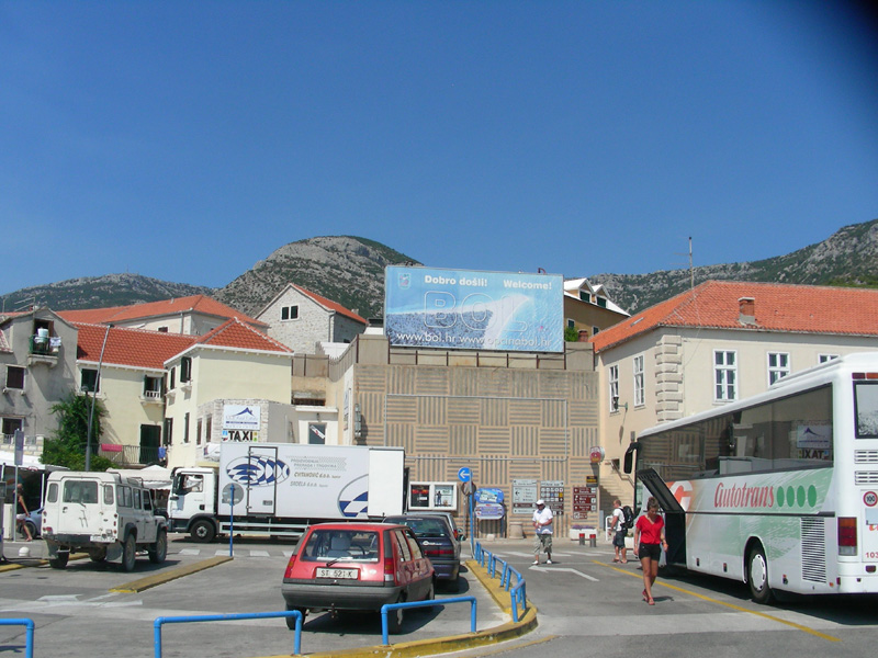 Autobus robi wywijasy na górskich drogach (dobrze, że porzuciłem myśl o wypożyczeniu rowerów). Ewa po solidnej dawce aviomarinu patrzy na widoki nieco obojętnie. Ja wręcz przeciwnie - ekscytuje mnie szyld "konoba" n aruderze na spalonym słońcem odludziu, czy też pierwszy widok na wyspę Hvar. Gdzieś daleko w dole widać słynny półwysep. Zjeżdżamy z wysokich gór aż do poziomu morza. Pierwsze wrażenie-nieszczególne.